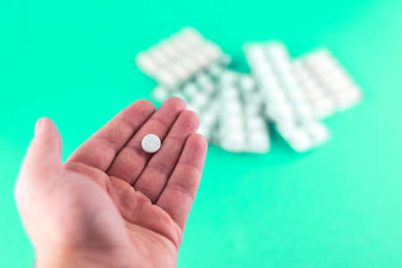 The man hand is holding a pill with copy space on aquamarine background. Focus on foreground, soft bokeh.
