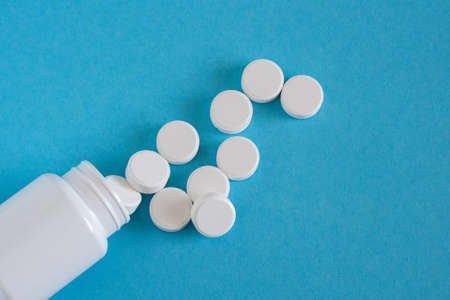 White round pills and bottle on blue background