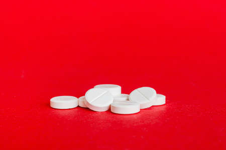 white color medical pills spilling on red background