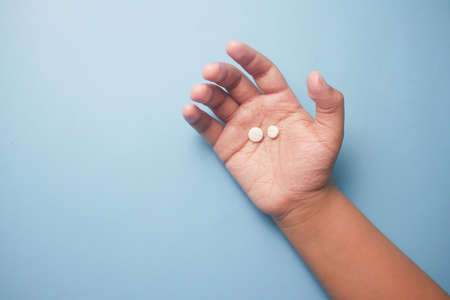 Female hand holding white pills on blue background. Medical minimalistic concept. Top view