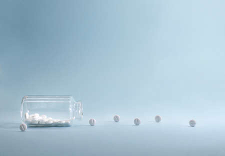 Transparent glass jar with white tablets rolling out of it. On a blue background.