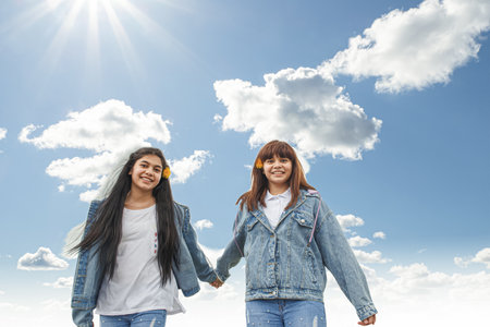 Two smiling girls against a cloudy sky. Love and friendship. Positive emotions.