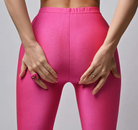 Closeup on slim woman buttocks and legs in pink leggings, holding sporty butt with hands, demonstrating dieting result