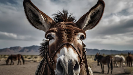 A mini donkey poses gracefully, showing its unique features against a rustic backdrop, surrounded by soft shadows and a clean white background.