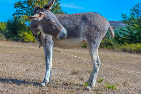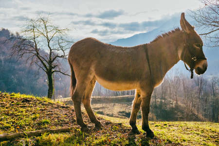 Brown donkey in a meadow on a farm. Raising cattle on a ranch, pasture