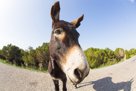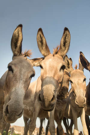Wild donkeys are waiting at the entrance of Karpaz national park for tourists who give them something to eat, Cyprus