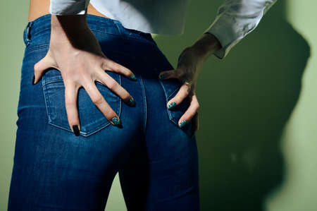 closeup picture on beautiful glamor girl hands holding her own sexy buttocks