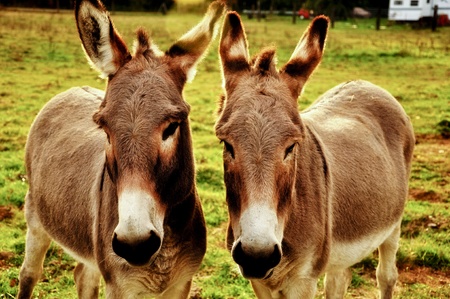 A beautiful grayish donkey on a green pasture in nature looking at camera
