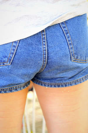 Woman showing her sexy curves. Hips and legs body part in short denim shorts.