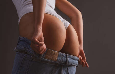 Female buttocks ass butt without cellulite. Skin treatment. Sexy body, butt in jeans denim.