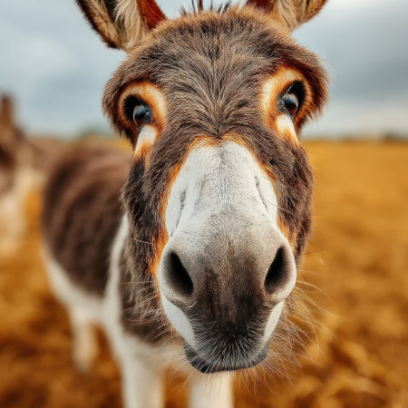 A donkey curiously approaches the camera in a golden field under cloudy skies.