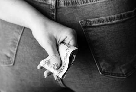 Beautiful and sexy girl leaned forward and covers her panties with a bundle of dollar bills, telling and tempting. The concept of love for money.
