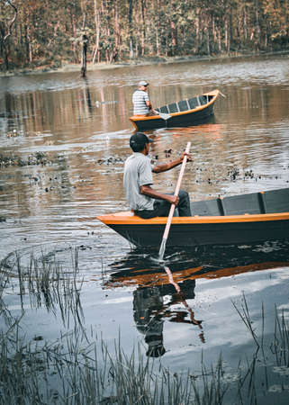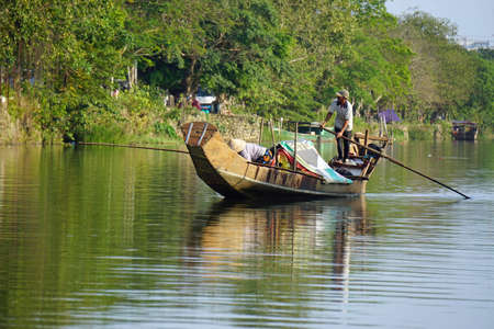 FEB 15, 2012 Dhaka, Bangladesh - Bangladesh local people on wooden row boat in river with tropical mangrove forest. Poverty social in South Asia