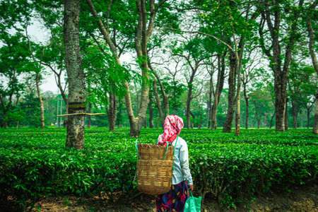 Darjeeling, West Bengal, India.-November 18, 2019: The world-famous Darjeeling tea. On the top of the mountain trees and a lush green tea plantation. The hard-working tea farmers.