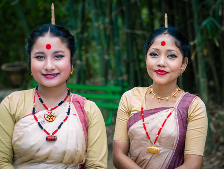 smiling girls closeup shot dressed in traditional wearing on festival with blurred background image is taken on the occasion of bihu at assam india.