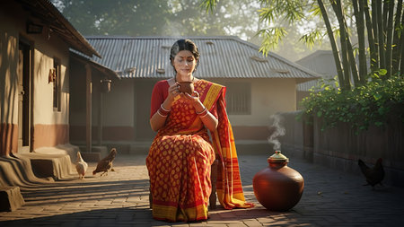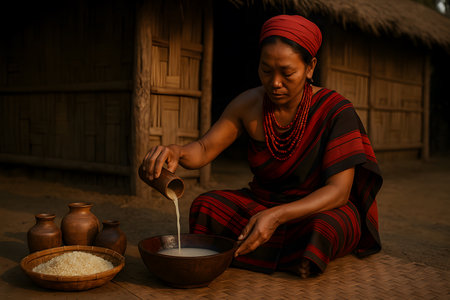 A Naga woman dressed in traditional red and black attire pours fermented rice beer Zutho into a wooden bowl. Surrounded by earthen pots and a bamboo tray of soaked rice, she sits outside a thatched bamboo house in soft golden light, reflecting indigenous craftsmanship and daily life in rural Nagaland, India.