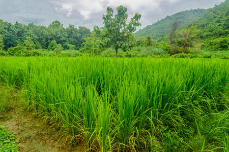 In the green paddy fields of the village enjoy the green beauty. Evening sunset on a beautiful natural green rice plant unripe rice in a paddy field in the village