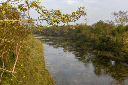 Landscape of lake and river in the morning time with fog at Kaziranga national park, Assam, India.