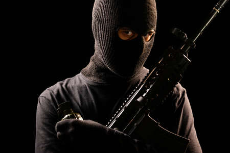 The Robber holding machine gun and hand grenade on black background