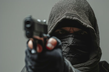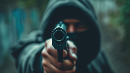 Masked robber with gun aiming into camera. Man in hood threatens with firearm. Weapon in persons hands. Murderer or armed thief. Criminal with pistol.