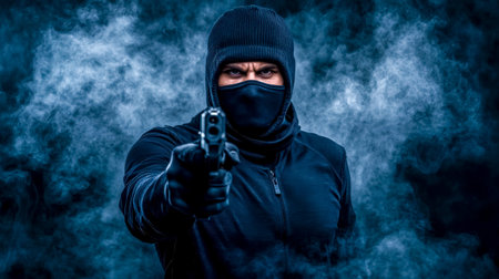 Masked criminal pointing gun in dark smoky environment