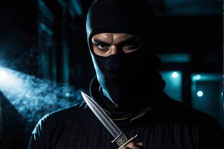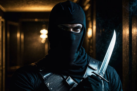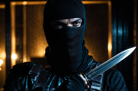 A man in a black mask holding a knife. The image has a dark and ominous mood. The man's face is hidden, but the knife is clearly visible, suggesting that he is a dangerous and menacing figure