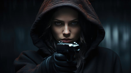 Cropped shot of female criminal (or thief) wearing hood and aiming handgun to the target. Conceptual of a person who commits a crime or force someone to do something against their will with weapon.