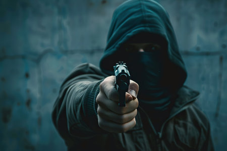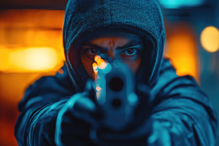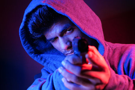 Hooded criminal aiming gun at night, crime scene