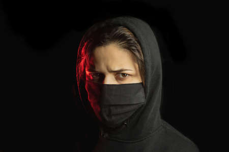 Portrait of beautiful woman with a black mask on the black background. Black and red portrait
