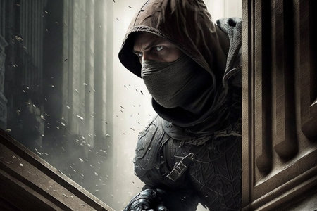 Evil man with gun and hood on his head, major plan