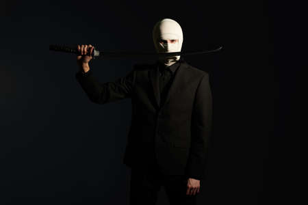 Business concept, Competitive wars. A warrior businessman in a classic black suit, with a bandaged face, stands on alert with a katana samurai sword. Studio portrait on a dark background.