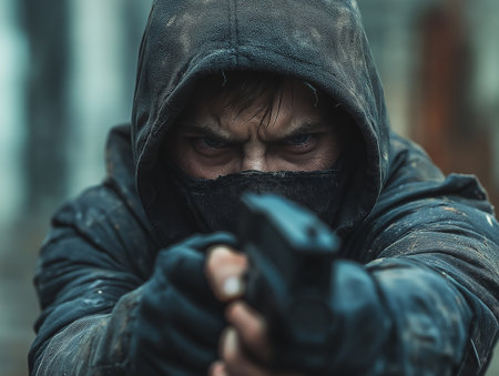 Armed man in a hood with a gun on a city street