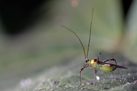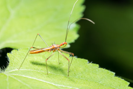 Berytidae on green leaf in the foreground