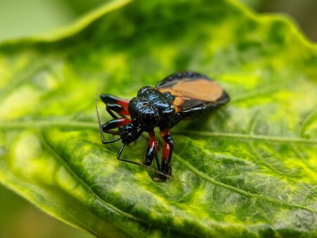 Assassin insect cinema insect close-up on the leaf. The leaf is held by hand.