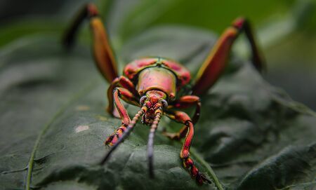 Closeup of beautiful insect on the tip of green leaf. This bug can be found in Borneo jungle