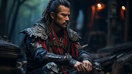 An experienced medieval warrior in armor and with a sword in a wooden house. Stage portrait. The Witcher man.