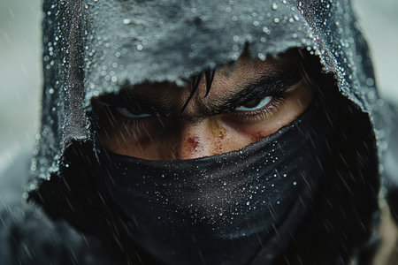A figure stands in an urban setting, their piercing eyes visible beneath a dark hood and mask. Rain droplets cling to their attire, enhancing the intense atmosphere surrounding them.