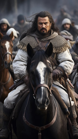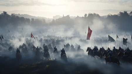 Medieval battle scene with cavalry and infantry. Selective focus.