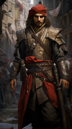 Elegant musketeer in historical attire, portraying bravery and chivalry in an enchanting renaissance setting, a symbol of classic heroism and adventure.