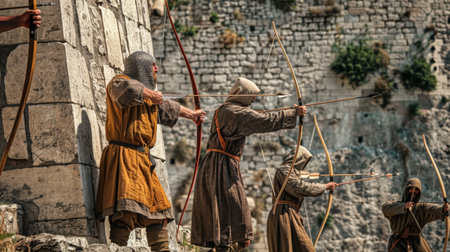A group of archers on an ancient fortress wall, drawing their bows as they aim at the approaching enemy, capturing the anticipation and strategic defense mechanisms of the time.