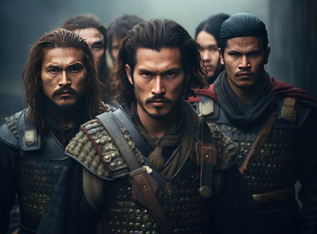 A ready battle soldier gazes intensely, surrounded by fellow warriors in armor.