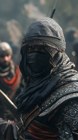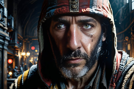A fictional person, not based on a real person. Fantasy portrait of a militant male assassin in an ancient assassin costume. The concept of ancient warriors. 3D rendering