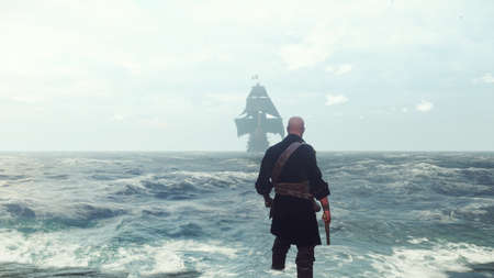 Pirate with pistols meets the ship on the sand beach of the pirate island. Concept scene of a pirate with a chest of gold,