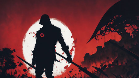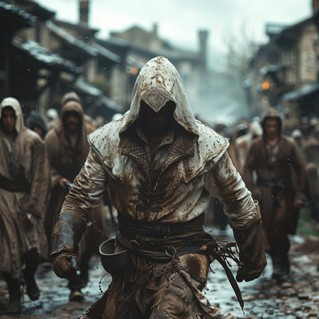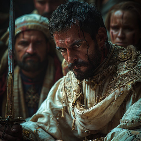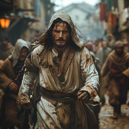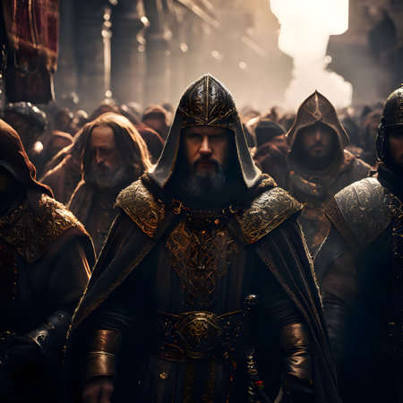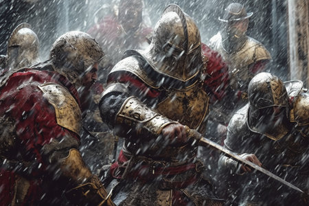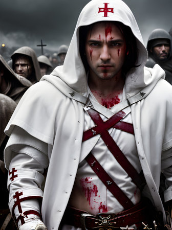 Detailed cinematic HDR: A crusader in a white coat with crosses on a blood Generative AI Generated