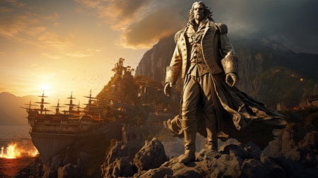 Experience the awe-inspiring presence of a majestic marble statue amidst the golden sunlight. Transport yourself to a vibrant medieval pirate bay, where adventure awaits at every turn. This captivating photograph captures the grandeur of national geographic and the timeless beauty of a bygone era.