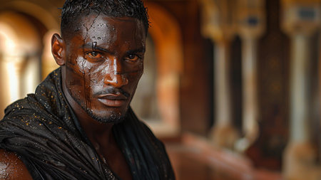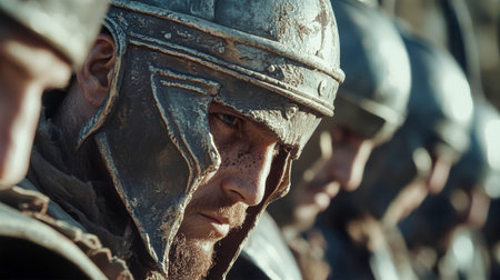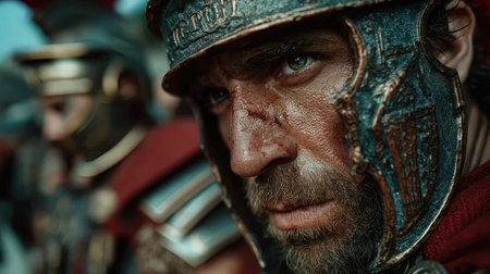 Close up of a Roman soldier with a determined expression, ready for combat.