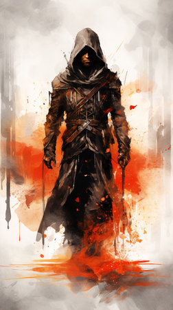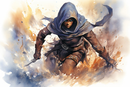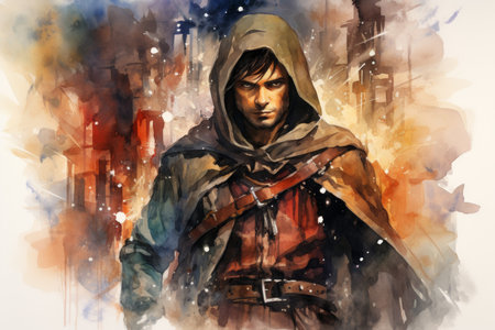 Digital watercolor painting of a hooded man with a sword in his hand