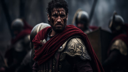Roman Legionnaire battle-worn facing advancing enemies