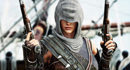 Close up portrait of a hooded female pirate assassin posing with her flintlock pistol weapons on the deck or her ship. 3d rendering