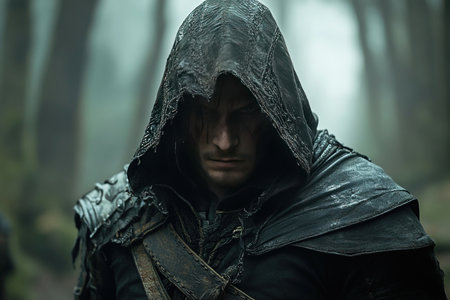 A cloaked warrior stands solemnly among ancient trees shrouded in mist preparing themselves for a stealthy mission. The ambiance suggests tension and anticipation in this foreboding environment.